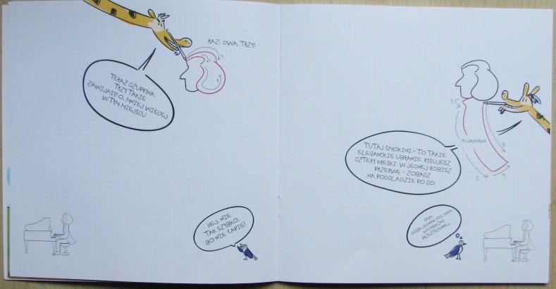 "Jak narysować Fryderyka Chopina" to jedna z całej serii książeczek "uczących" krok po kroku narysować konkretny obrazek. Przewodnikiem jest żyrafa Grażynka (nawiasem mówiąc - skąd się ona wzięła w Parku Łazienkowskim?) i jej sceptyczny towarzysz - Gwarek.